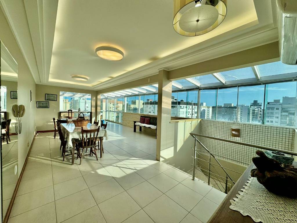 Parte de baixo: 02 dormitórios (02 suítes) Banheiro social Ampla sala de estar Sacada integrada fechada Parte de cima: Ampla sala de jantar Churrasqueira Fogão a lenha Cozinha aberta Área de serviço separada Lavabo Terraço Descritivo: 206, 26m² área privativa 276, 18m² área total Mobiliado Leste/ Sul 02 box térreo outro no segundo