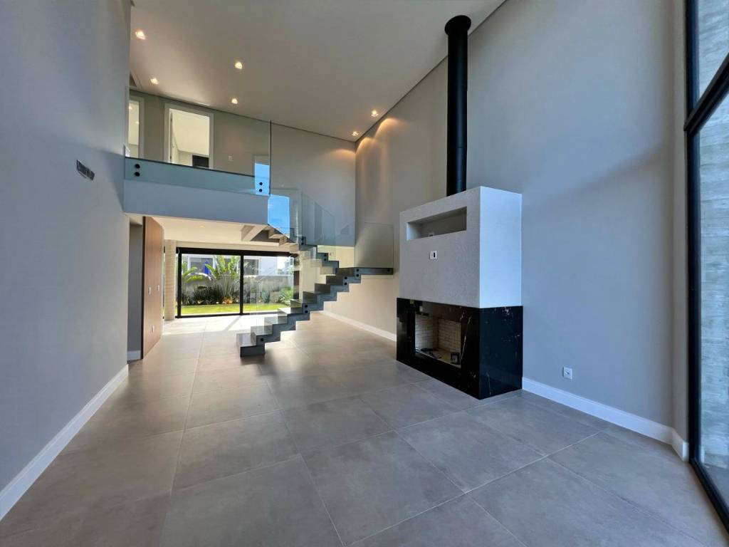 Terreno com 256, 28 m2. Casa contemporânea com 217, 65 m2.?Área social ampla e integrada. Iluminação e ventilação abundantes. Fachada de concreto aparente e ripados. ?Esquadrias de PVC. Persianas motorizadas nos dormitórios. Espera para piscina. ?Deck com jardim. ?Sala de estar com pé direito duplo e lareira. Sala de jantar integrada com visual para jardim Cozinha com ilha e churrasqueira. Lavanderia com acesso frontal. Lavabo. 4 suítes (uma no térreo).?Depósito com acesso frontal.