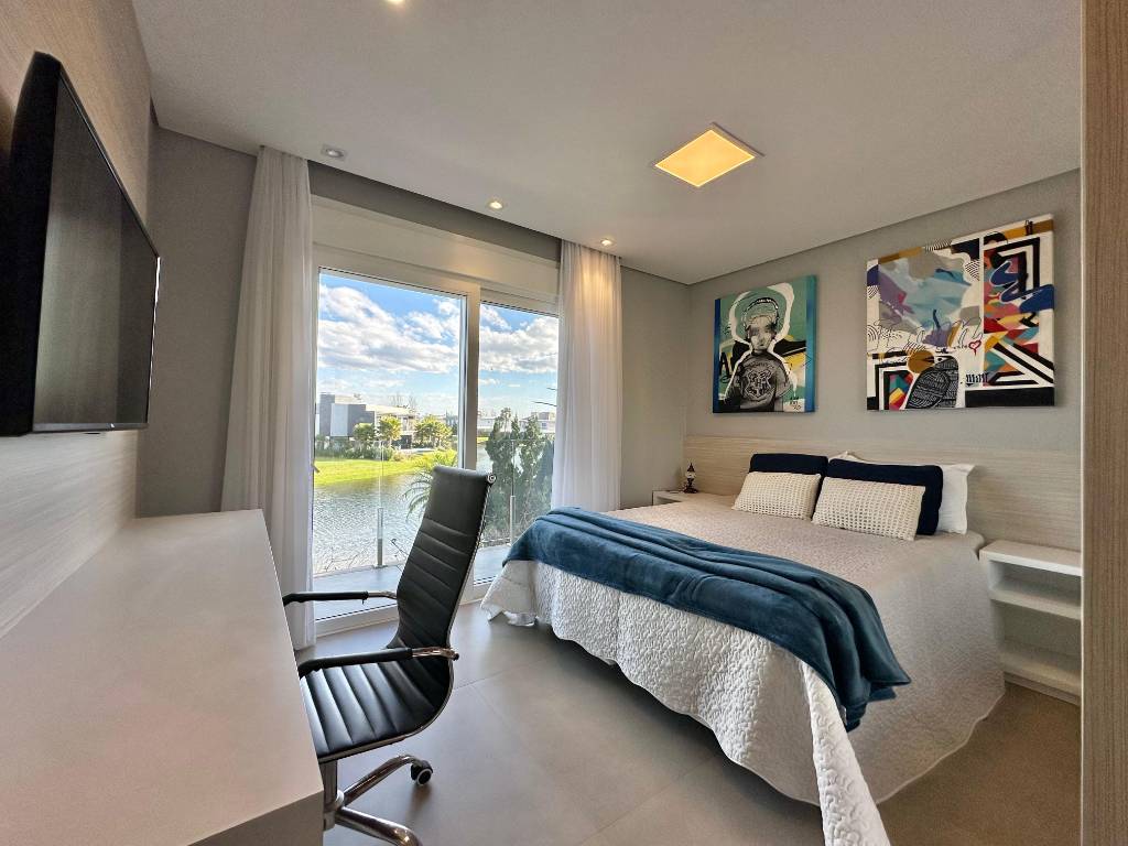 CONDOMÍNIO ENSEADA SOBRADO A VENDA Sobrado com 331 m² 06 Suítes (sendo uma térrea e uma master ) Mobiliado e decorado Living 04 ambiente, Espaço Gourmet amplo com churrasqueira, Lavabo, Area de serviço, Piscina em concreto com borda infinita, Persianas automatizadas, 100% climatizado, Estar íntimo no mezanino, Frente Norte Garagem coberta para 02 carros.